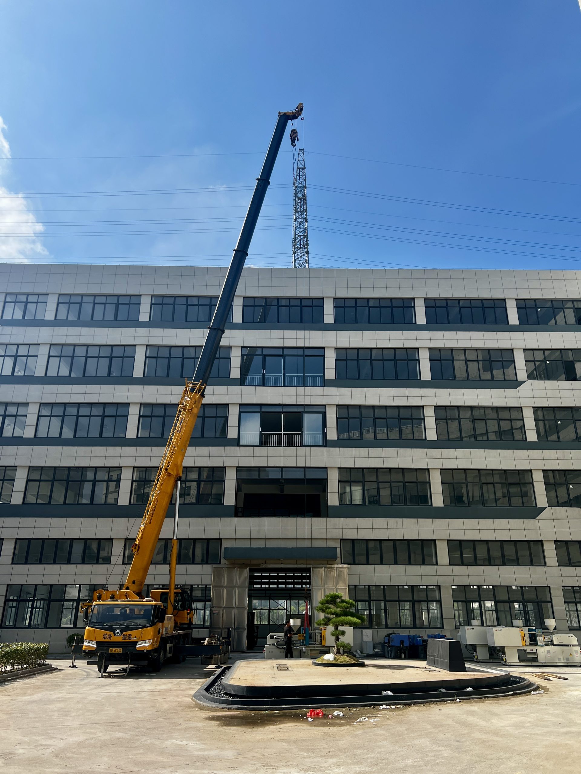 With the completion of the factory’s interior decoration, large-scale equipment installation has officially begun. As shown in the photo, a crane is used to hoist heavy machinery into the second floor of the new plant. This marks a key step in bringing the facility into operation, laying the groundwork for upcoming production activities.