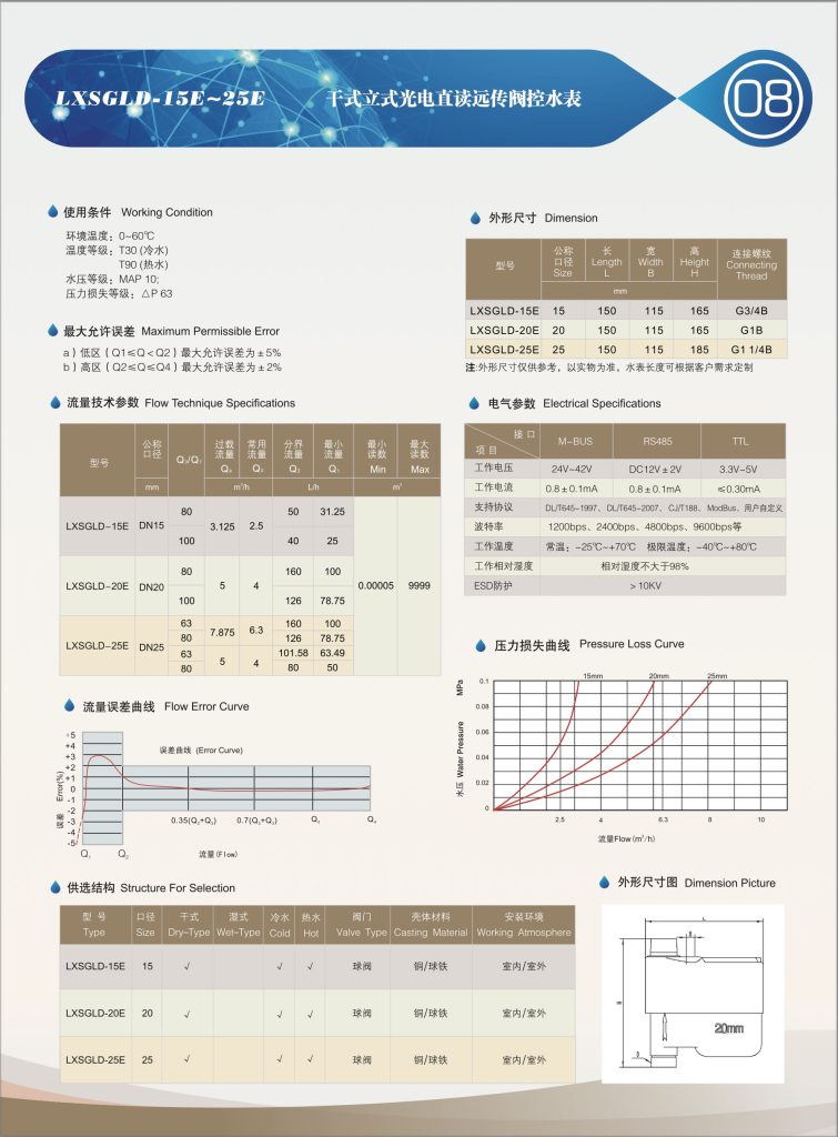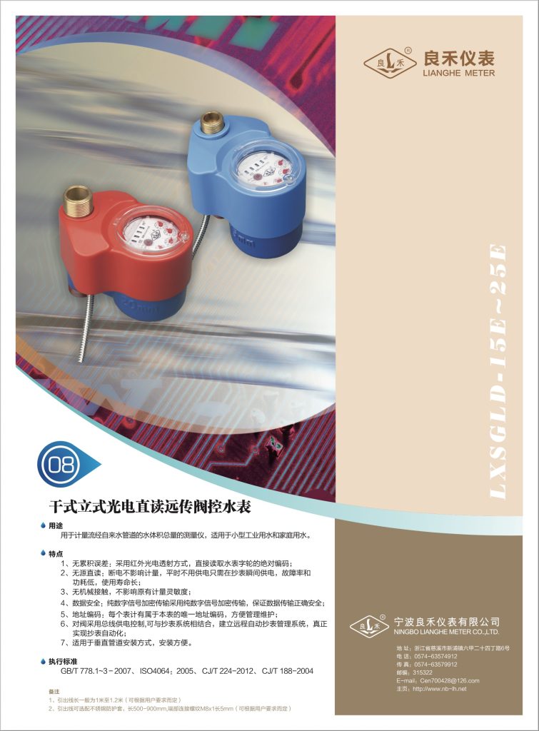 The photoelectric direct-reading vertical dry-type remote water meter provides clear digital reading and reliable data transmission. Built on the dry-type mechanical base, it is further equipped with a remote-controlled valve, enabling on/off water supply management for enhanced efficiency and convenience.